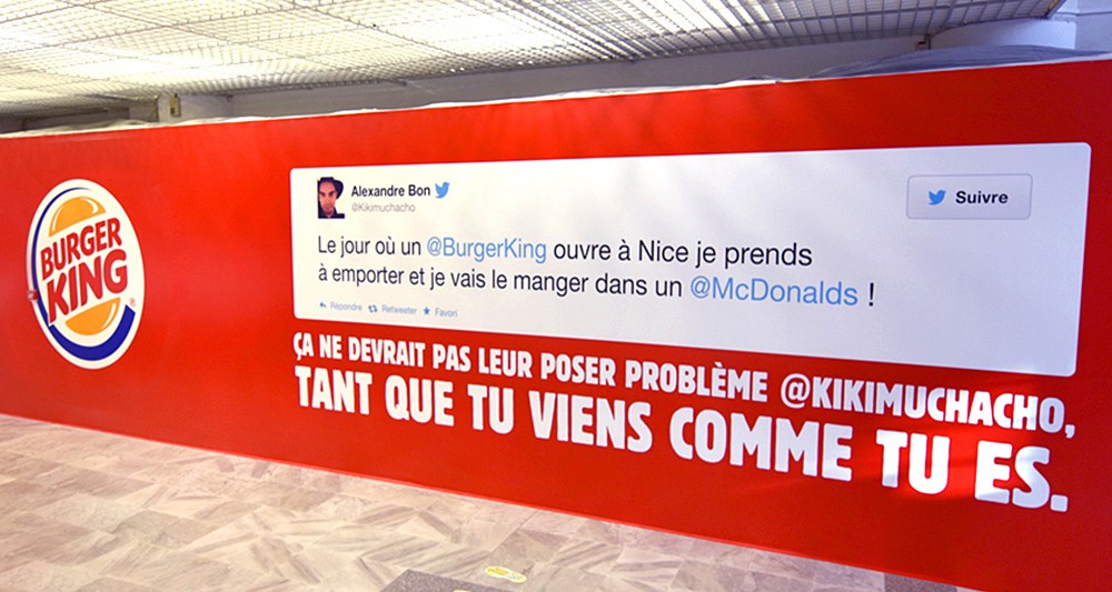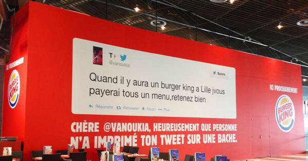 Autre grande entreprise maîtrisant parfaitement sa stratégie web, Burger King gère sa stratégie en proposant à sa communauté de décider elle-même du prochain lieu d’ouverture de sa chaîne de fast-food. Une simple question ouverte du style “Le prochain Burger King, vous le souhaiteriez dans quelle ville ?” permet un engagement de ses fans et d’associer réel et digital. La twittosphère s’agite et ce concept permet au dernier commentaire de gagner l’endroit d’implantation et son tweet affiché sur la devanture en travaux avec une réponse ironique du groupe américain !