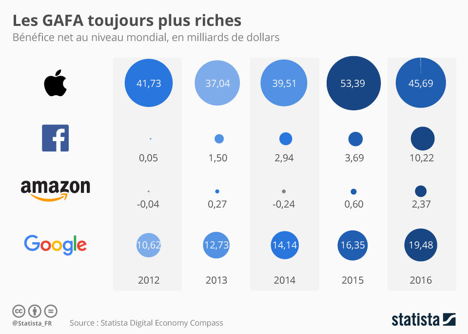 GAFA est l’acronyme donné aux 4 sociétés considérées comme leaders de l’économie numérique dans le monde. En effet, Google, Amazon, Facebook et Apple représentent à eux seuls le PIB du Danemark. Rien que ça !